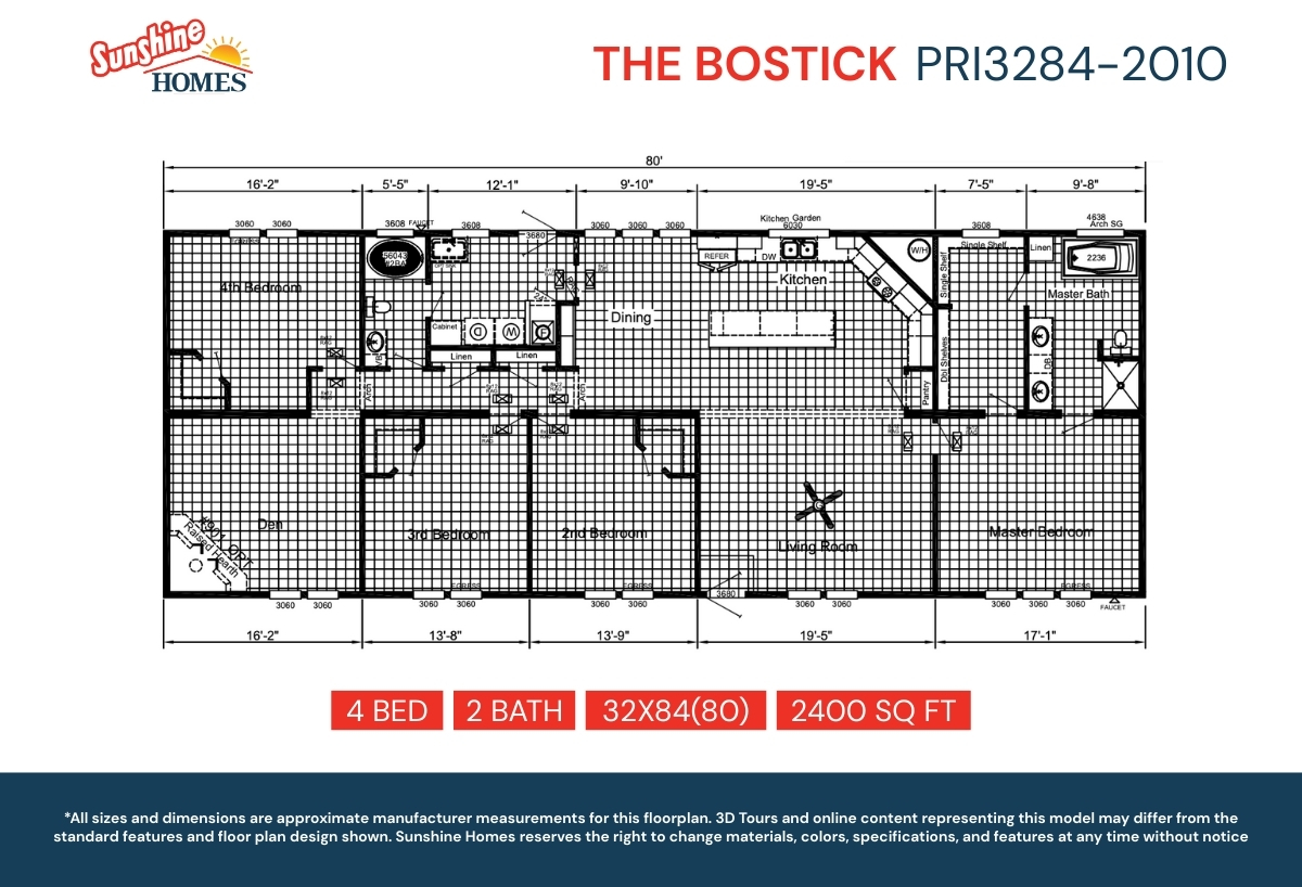 The Bostick PRI3284-2010 with 9 Foot Sidewalls is a spacious 4-bedroom, 3-bath home with 2400 sq. ft. of living space. Fea...